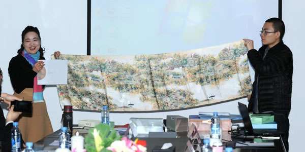 在非物质文化遗产创新传承成功经验分享程序座谈中,来自江苏苏州,河北蔚县、曲阳的非物质文化传人也与大家共同分享了各自的主题议题。世界非物质文化遗产大会中国区副秘书长、苏州老万年文化发展有限公司董事长戚春兰。她是多项(金银雕刻,丝绸,旗袍)非遗项目传承人,戚女士主讲了苏州老万年丝绸为一带一路论坛设计“总统夫人礼品丝巾”的感悟。![]()